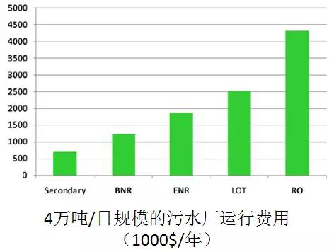 極限脫氮除磷(LOT)較傳統脫氮除磷(BNR)投資增加很小,運行費用有一定程度增加。概念廠選擇的是極限氮磷水處理,按現有技術,不考慮國家標準,按工程界的看法,處理到這程度,總體性價比是很好很合理的。