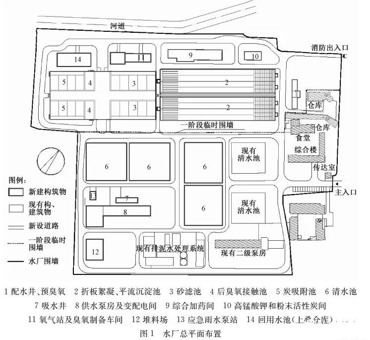 (1)構(gòu)筑物多、設(shè)備陳舊、總圖凌亂。水廠自建成的近60年時(shí)間里,先后經(jīng)歷多次擴(kuò)容、改造,形成了現(xiàn)在多個(gè)處理構(gòu)筑物,總圖布置分散、凌亂,且多個(gè)構(gòu)筑物和很多設(shè)備都存在問(wèn)題。如現(xiàn)有吸水井分為高、低水位2格吸水井,多年運(yùn)行管理實(shí)踐表明高、低水位運(yùn)行切換麻煩,節(jié)能效果也不明顯;加藥間設(shè)備陳舊需要逐一更換,其內(nèi)部布置、土建分隔亦有多處需要改造,而且現(xiàn)有工藝設(shè)備也不能滿足新增加藥劑的要求;水廠的清水池庫(kù)容僅2.2萬(wàn)m3,庫(kù)容偏小;2座二級(jí)泵房和2座原水泵房?jī)?nèi)水泵機(jī)組匹配都不合理、效率低下、自動(dòng)化程度低。